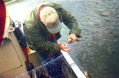 one of our biologists removes a walleye from a gill net. Hundreds of walleye